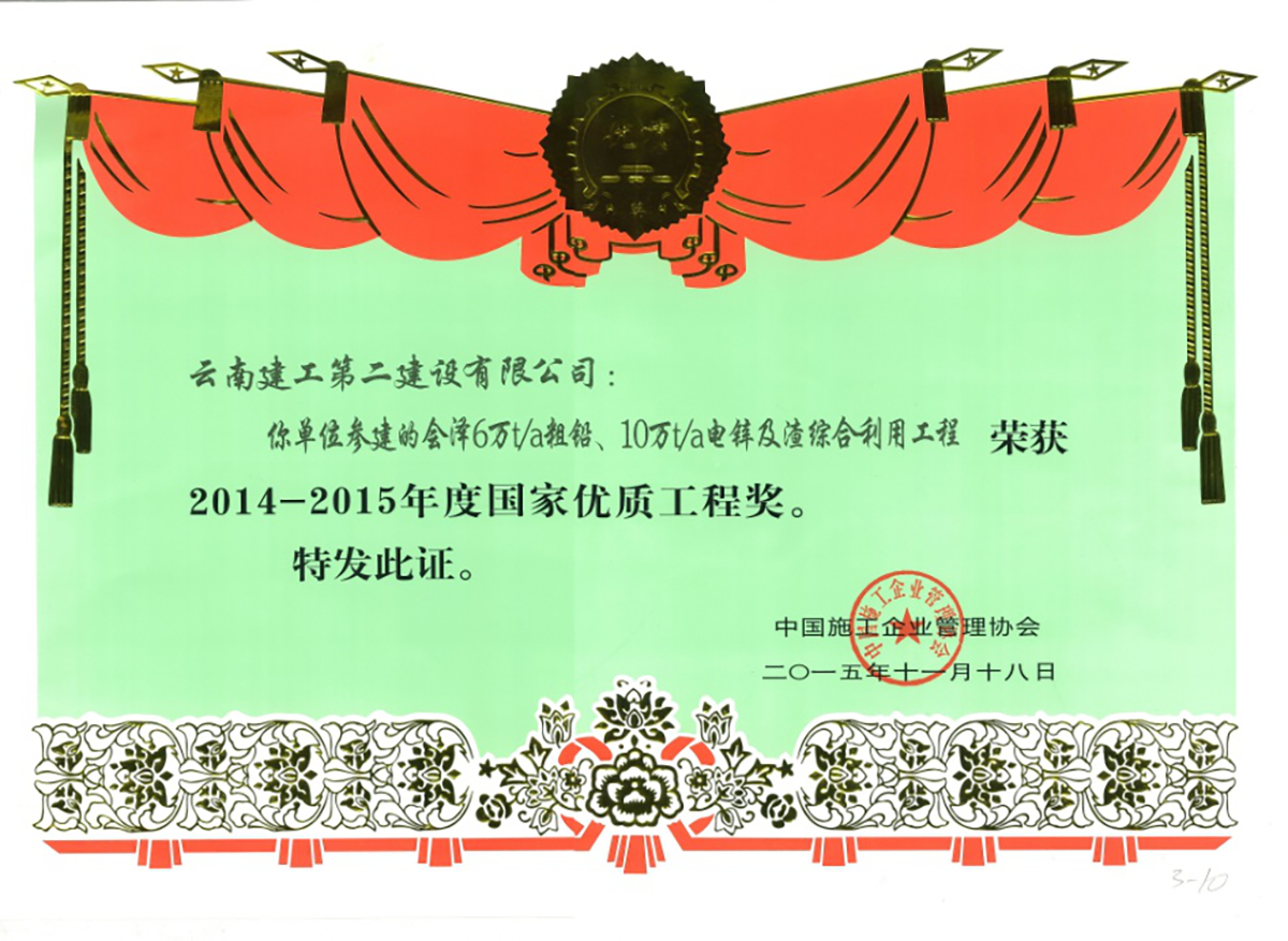 12 | 會澤6萬t/a粗鉛、10萬t/a電鋅及渣綜合利用工程 | 中國施工企業(yè)管理協(xié)會 | 2014 | |